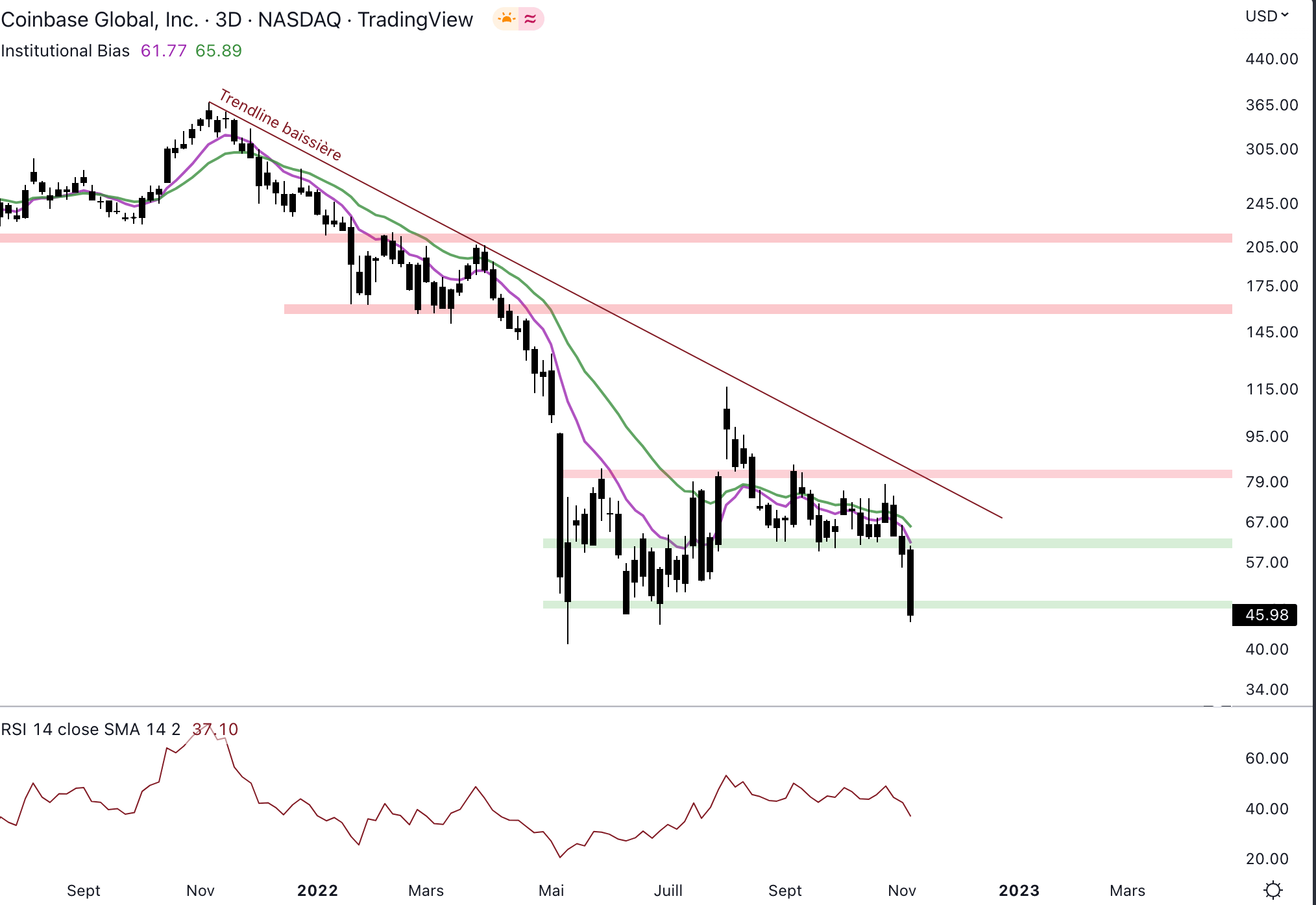 Coinbase de retour en bas de range à 48 $