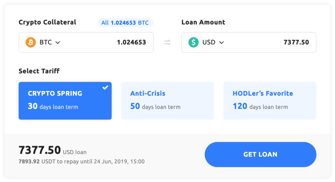 Étape 2 : Utilisez ce BTC comme garantie sur YouHodler. Avec 90% du ratio prêt/valeur, vous recevez 90% des 8 000 USD en espèces ou en USDT.