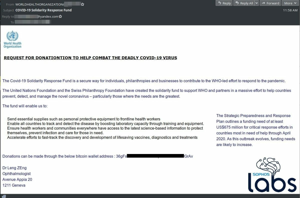 Toujours selon Sophos, des escrocs tentent de se faire passer pour des membres de l’Organisation mondiale de la Santé (OMS, ou World Health Organization/WHO en anglais).
