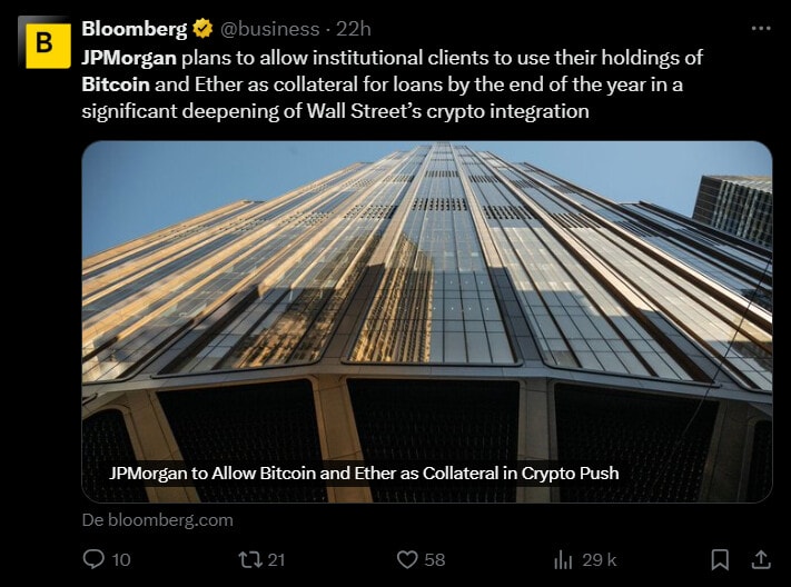 JPMorgan va accepter des bitcoins et des ethers en collatéral de ses prêts institutionnels – Source : Compte X
