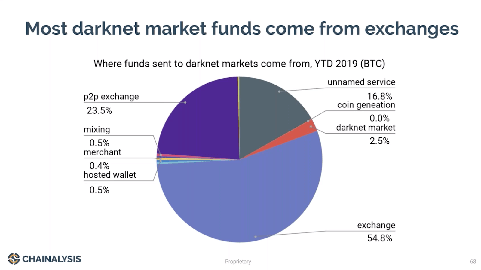 Sur le premier graphique présenté ci-dessous, Chainalysis explique que seulement 2,7 % des BTC arrivant sur des services de mixage proviennent des marchés noirs illégaux du Darknet. En fait, on constate que la source principale de ces transactions mixées est même tout simplement… les crypto-exchanges ! Et ce à hauteur de 40%.