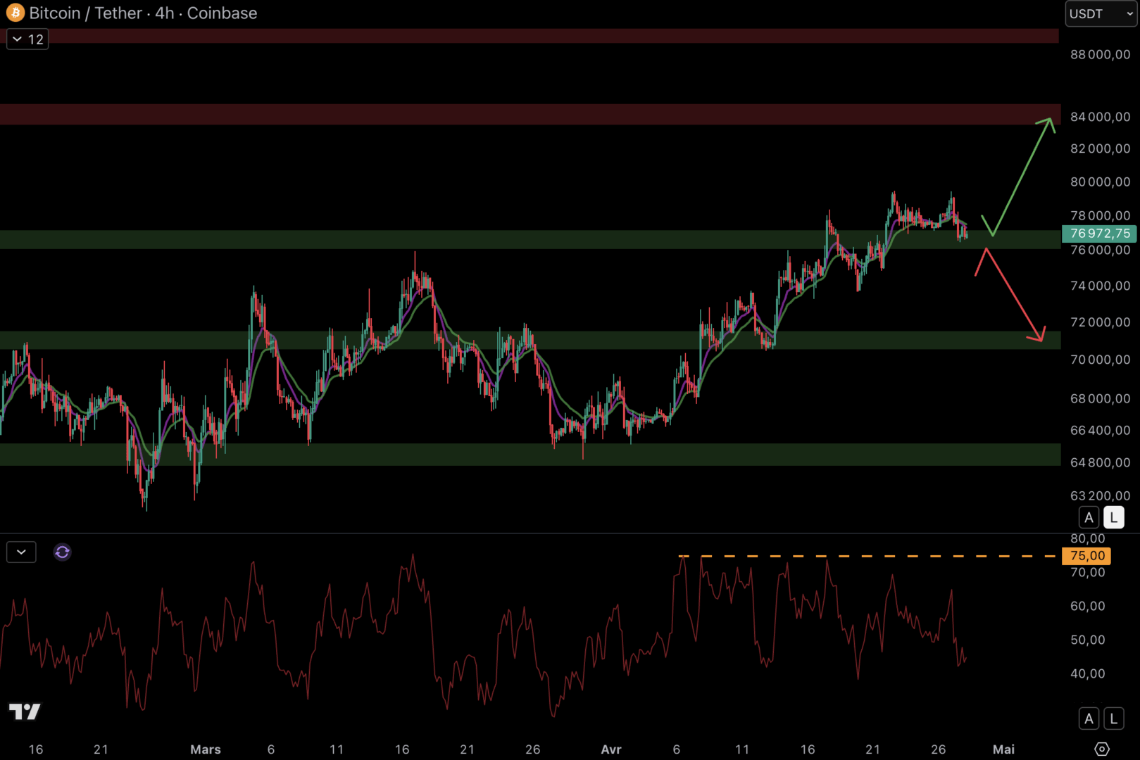 Les acheteurs doivent se montrer ici, car en cas de chute sous le niveau de support, le cours pourrait rejoindre les 71 000 $. On observe des divergences à court terme, le RSI indique un affaiblissement du mouvement de hausse.