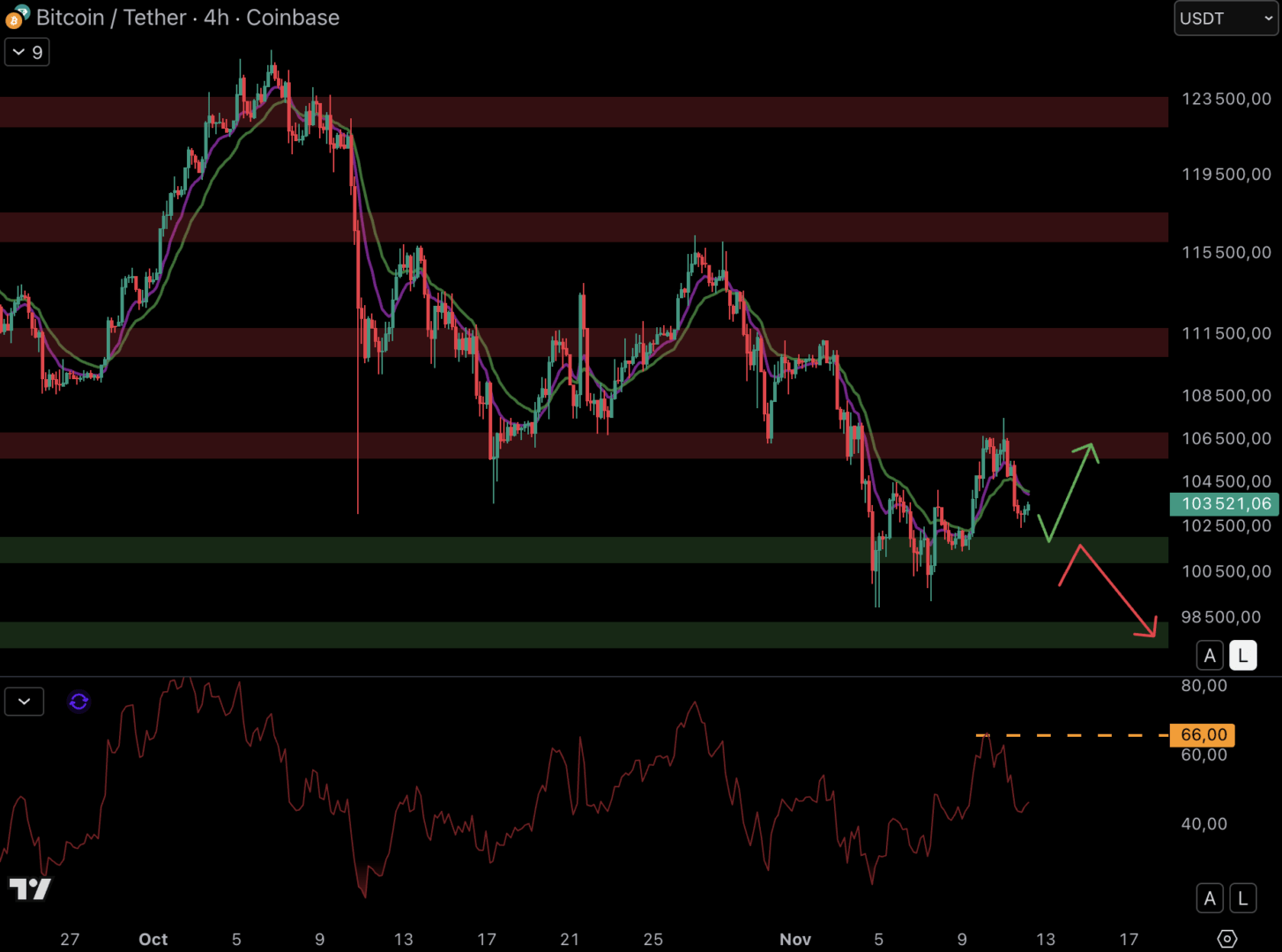 Pour éviter une nouvelle baisse sur le BTC, il faudra conserver le support à 101 500 $. Si le cours rebondit, il pourrait retrouver la résistance à 106 500 $. Pour continuer à se développer à la hausse, le roi des cryptos devra casser cette résistance. Le RSI grimpe globalement depuis le 4 novembre, et pour poursuivre sur cette voie, il devra passer au-delà de 66. Un scénario qui permettrait d’avoir un momentum solide.