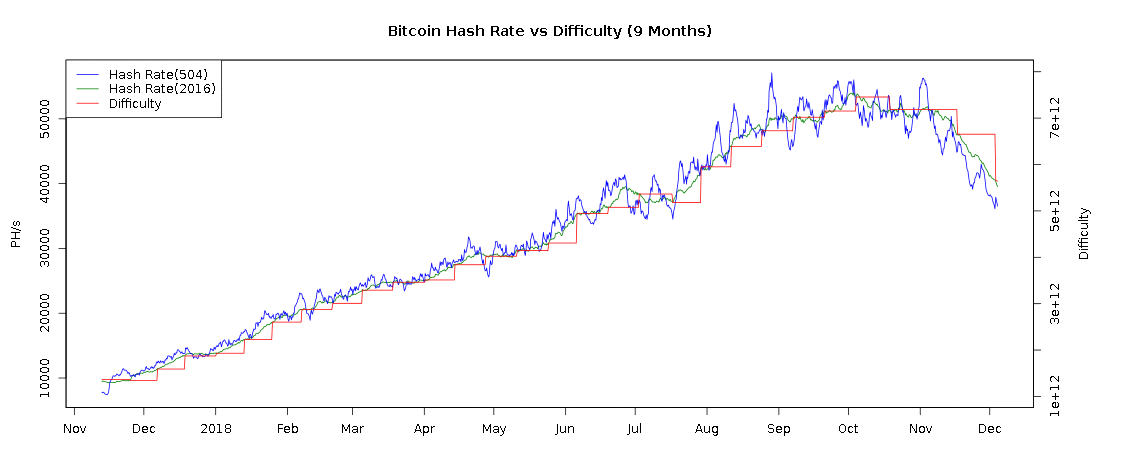 Hashrate et difficulté du minage de Bitcoin sur 2018 – Source : bitcoinwisdom.com