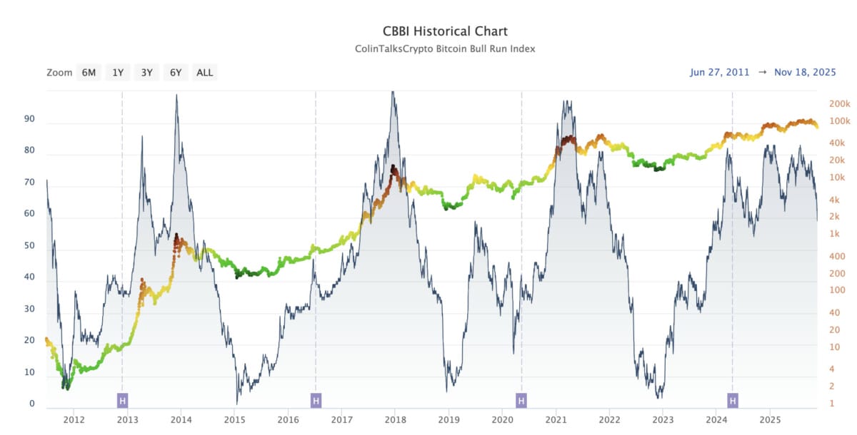 L’indicateur ColinTalksCrypto Bitcoin Bull Run Index (CBBI) permet d’avoir une idée de l’avancée du marché haussier du BTC en se basant sur neuf métriques (Pi Cycle top, Puell Multiple, MVRV Z-Score, RHODL Ratio, etc.). Le CBBI rassemble donc plusieurs données on-chain et techniques pour savoir si le BTC est en surchauffe. Lors des précédents bull run, des tops de marché se sont mis en place quand le CBBI a dépassé 90 :