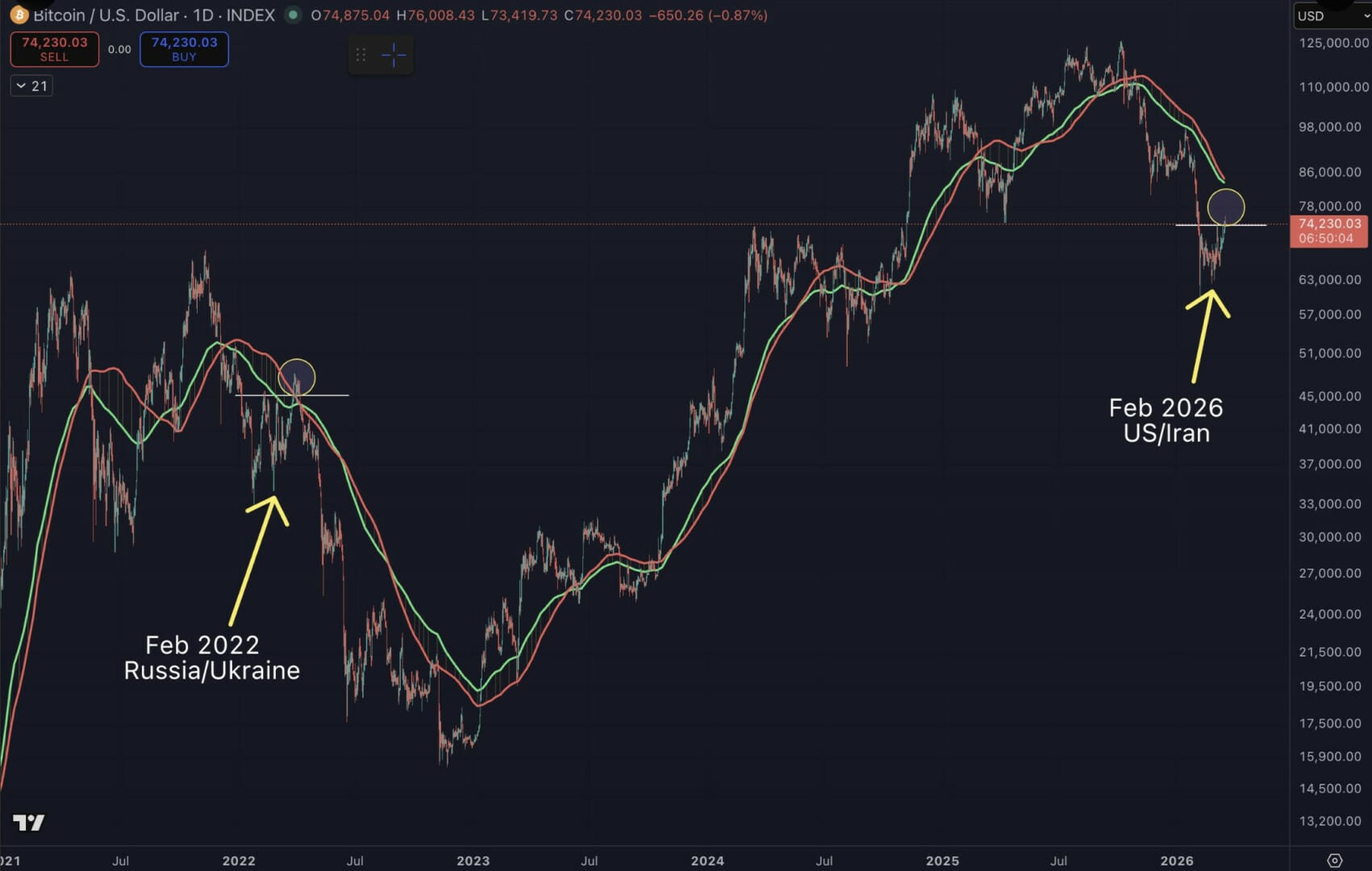 Comme lors du marché baissier de 2022, le cours du Bitcoin rebondit en plein conflit et il est dans une situation délicate (sous les moyennes mobiles). Si le même scénario se reproduit, le roi des cryptos pourrait potentiellement rejoindre les 85 000 $ avant de plonger sous les 60 000 $.