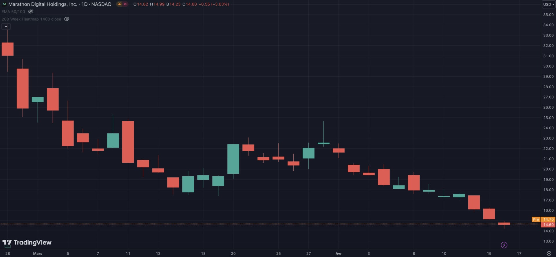 Anticipation stratégique du marché ou véritable inquiétude, les prix des actions associées aux principaux mineurs de BTC enregistrent des baisses importantes à l’approche du halving. Comme par exemple dans le cas des géants Marathon Digital (MARA) et Riot Platforms (RIOT) qui accusent respectivement des reculs de 53 % et 54 % depuis leurs sommets de février dernier.