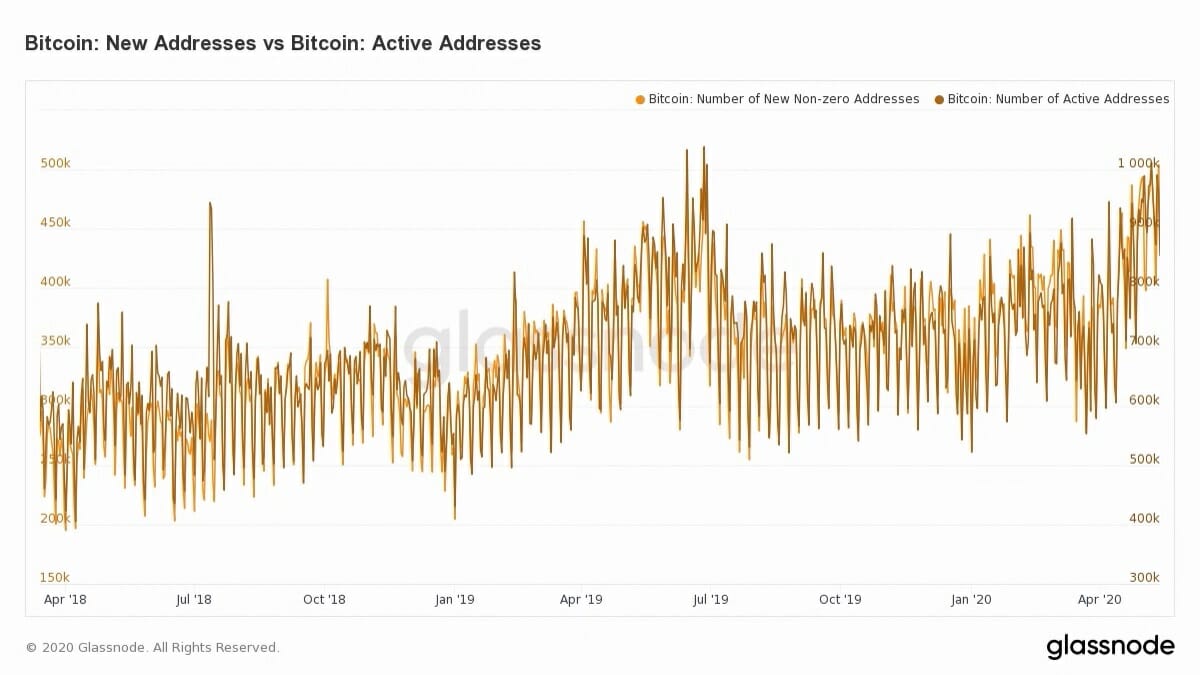 Pareille quantité n’avait plus été vue depuis juin 2019, et seul le plus fort de la bulle spéculative de fin 2017 où Bitcoin avait brièvement touché les 20 000 $ – avait vu plus d’adresses BTC actives. Le record à battre est à 1,28 millions d’adresses actives (vu le 14 décembre 2017). Le verra-t-on dépassé suite au halving ?