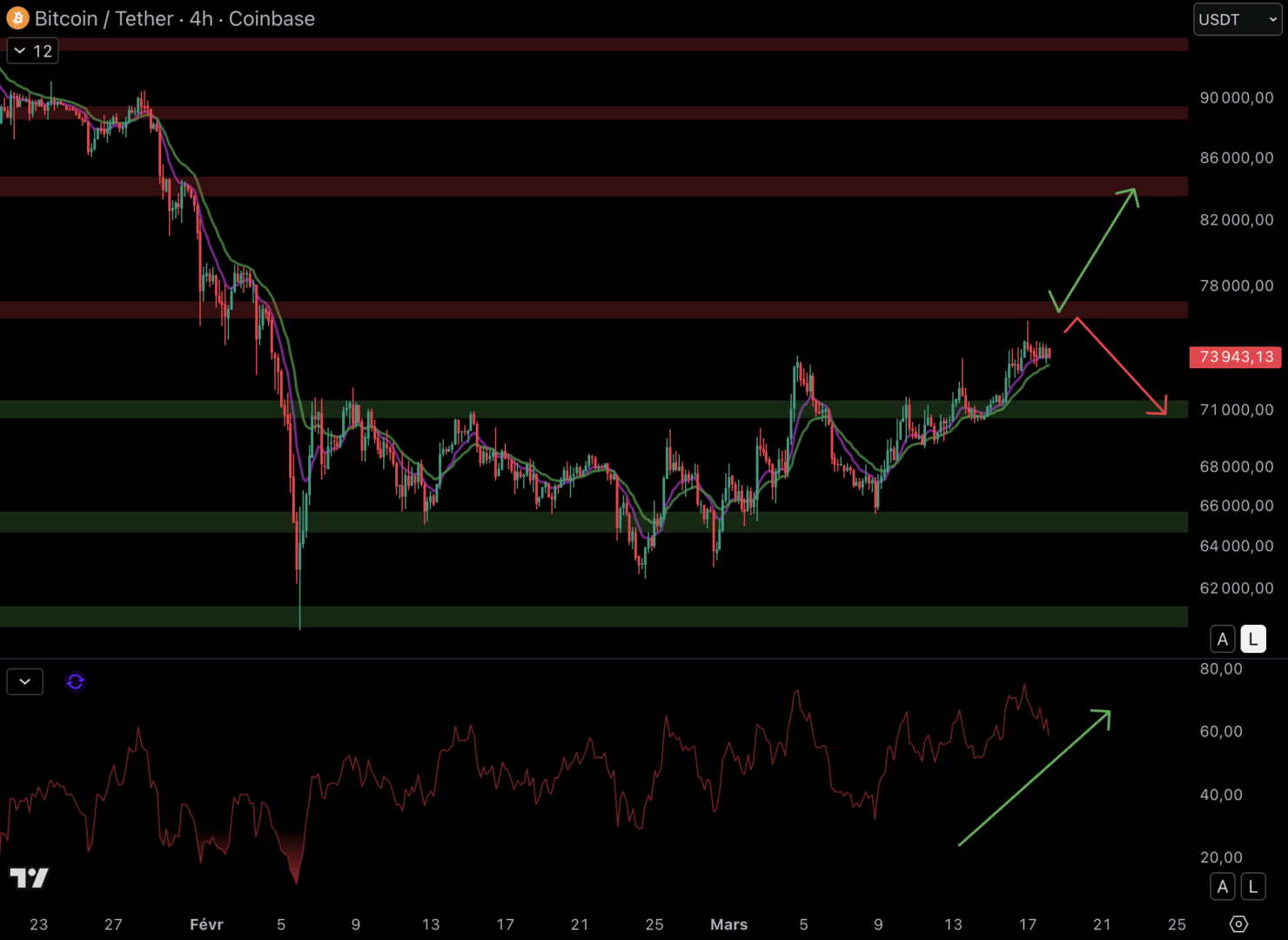 Si les acheteurs gardent la main et que la résistance à 76 500 $ est cassée, une hausse vers la prochaine résistance à 84 000 $ est possible. Mais si le cours a marqué un top local, il pourrait rejoindre le support à 71 000 $. Le RSI chute, mais les structures restent globalement haussières. Le momentum est dans les mains des acheteurs en 4H.