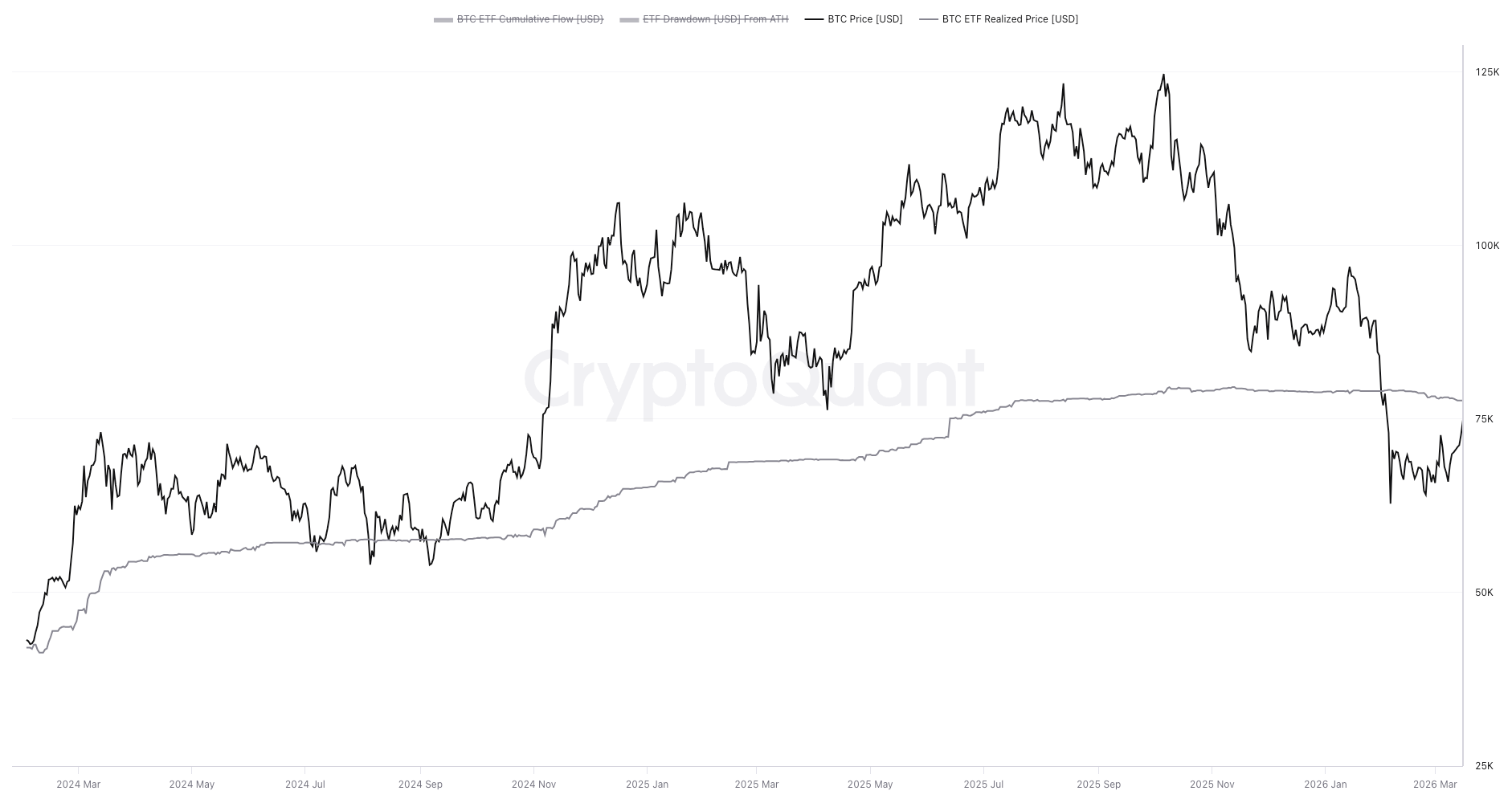 Evolution du cours du Bitcoin et du prix moyen d’achat des BTC sur les ETF au comptant. Source : CryptoQuant