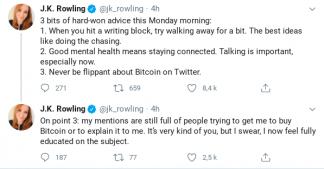 Visiblement noyée sous les sollicitations justement non sollicitées, l’écrivaine demandait ce matin de pouvoir retrouver un peu de tranquillité : elle serait donc loin de se précipiter à Gringotts pour liquider son épargne et tenter un all-in romanesque sur Bitcoin !