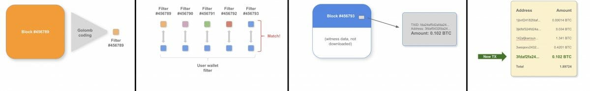 - Étape 3 – Téléchargement des blocs pertinents : si un filtre indique qu’un bloc contient des transactions pertinentes, le client Neutrino demandera le bloc, et une fois le bloc téléchargé, le client peut analyser le bloc, à la recherche de la ou des transactions pertinentes.