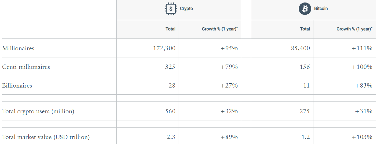 Passons maintenant aux millionnaires et aux milliardaires de la crypto qui ont vu leur nombre exploser cette année comme on peut le voir sur le tableau ci-dessus issu des travaux conjoints de Henley & Partners et de New World Wealth. On peut voir dans la colonne Growth – c’est-à-dire croissance – que les données sont massivement en hausse : +95% pour le nombre de millionnaires en crypto, +79 % pour les centi-millionnaires (personnes ayant plus de 100 millions) et +27% pour les milliardaires. Du côté de Bitcoin, c’est encore plus fort avec +111% pour les millionnaires, +100 % pour les centi-millionnaires et +83% pour les milliardaires. Enfin, le nombre d’utilisateurs total s’élève à 560 millions de personnes pour la crypto en général et 275 millions de personnes pour Bitcoin en particulier.