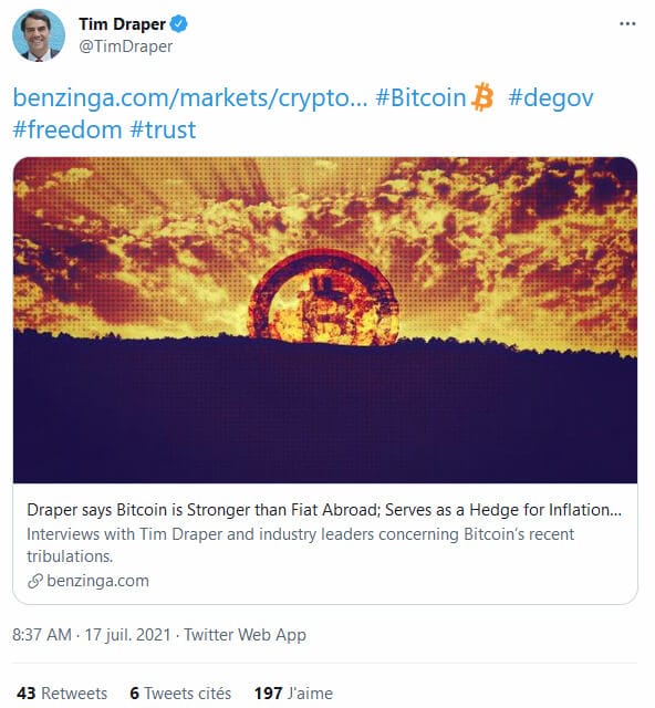 En 2015, alors que Bitcoin valait moins de 500 dollars, le capital-risqueur avait prédit avec précision que l’actif dépasserait les 10 000 dollars fin 2017. 2 ans plus tard, l’investisseur a vu Bitcoin largement dépasser les 18 000 dollars. Il faudra donc réfléchir à 2 fois avant de définitivement écarter les prédictions de Draper.