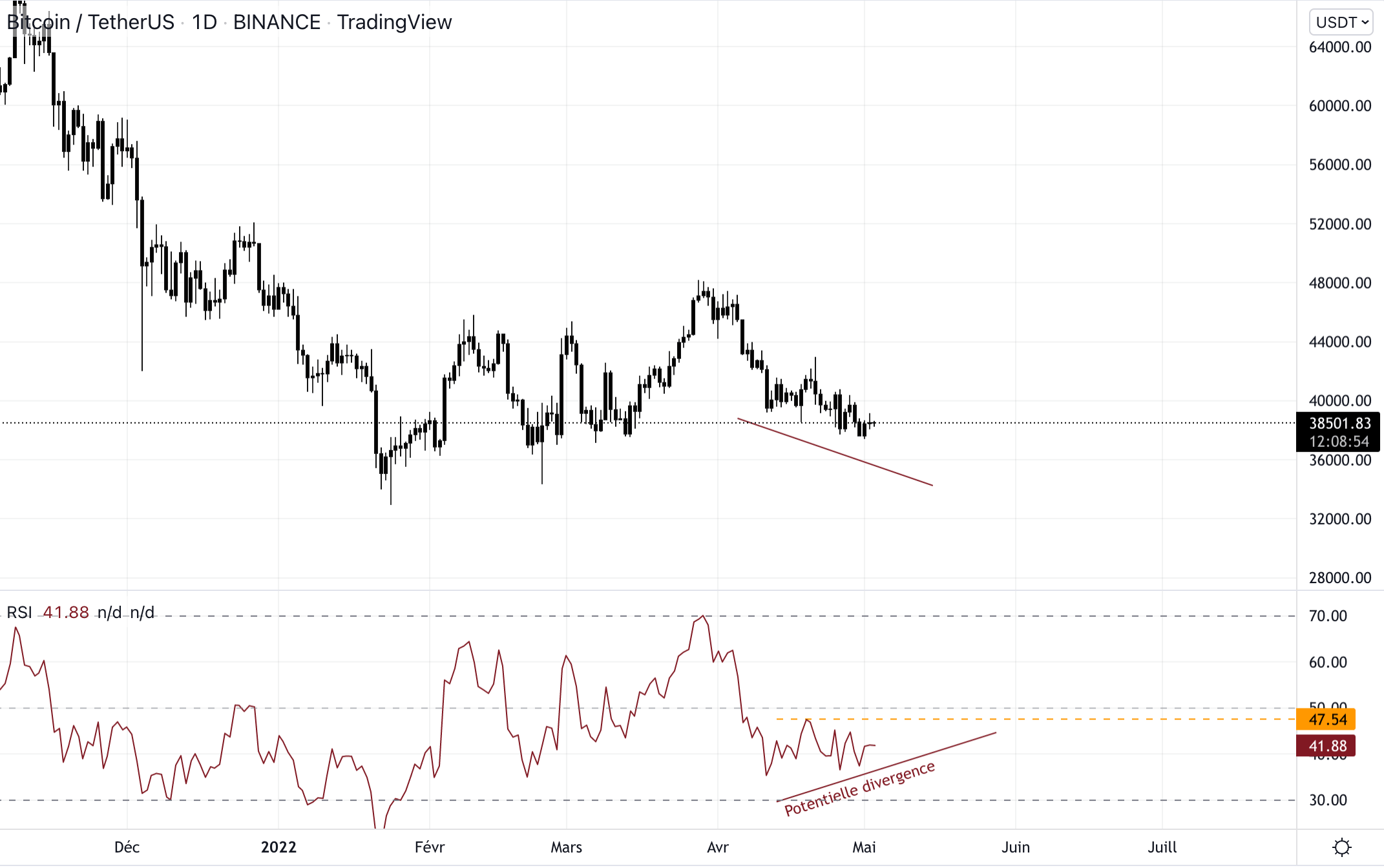 Le Bitcoin reste sur une structure haussière en unité de temps hebdomadaire. Cependant, en unité de temps journalier, les vendeurs ont repris la main depuis ce « M top ». Sur le momentum RSI, une potentielle divergence se dessine actuellement. Pour qu’elle se confirme, il faut que le RSI clôture au-dessus de 48.