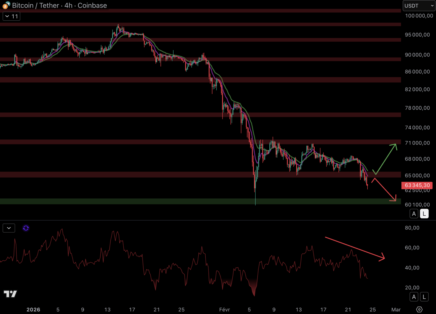 Ainsi, le cours pourrait se diriger vers le support à 60 500 $. Pour éviter ce scénario, il faudra parvenir à revenir au-delà de la résistance à 65 000 $. Le RSI, lui, se fragilise à nouveau. Et cela indique que le momentum ne profite plus aux acheteurs à court terme.