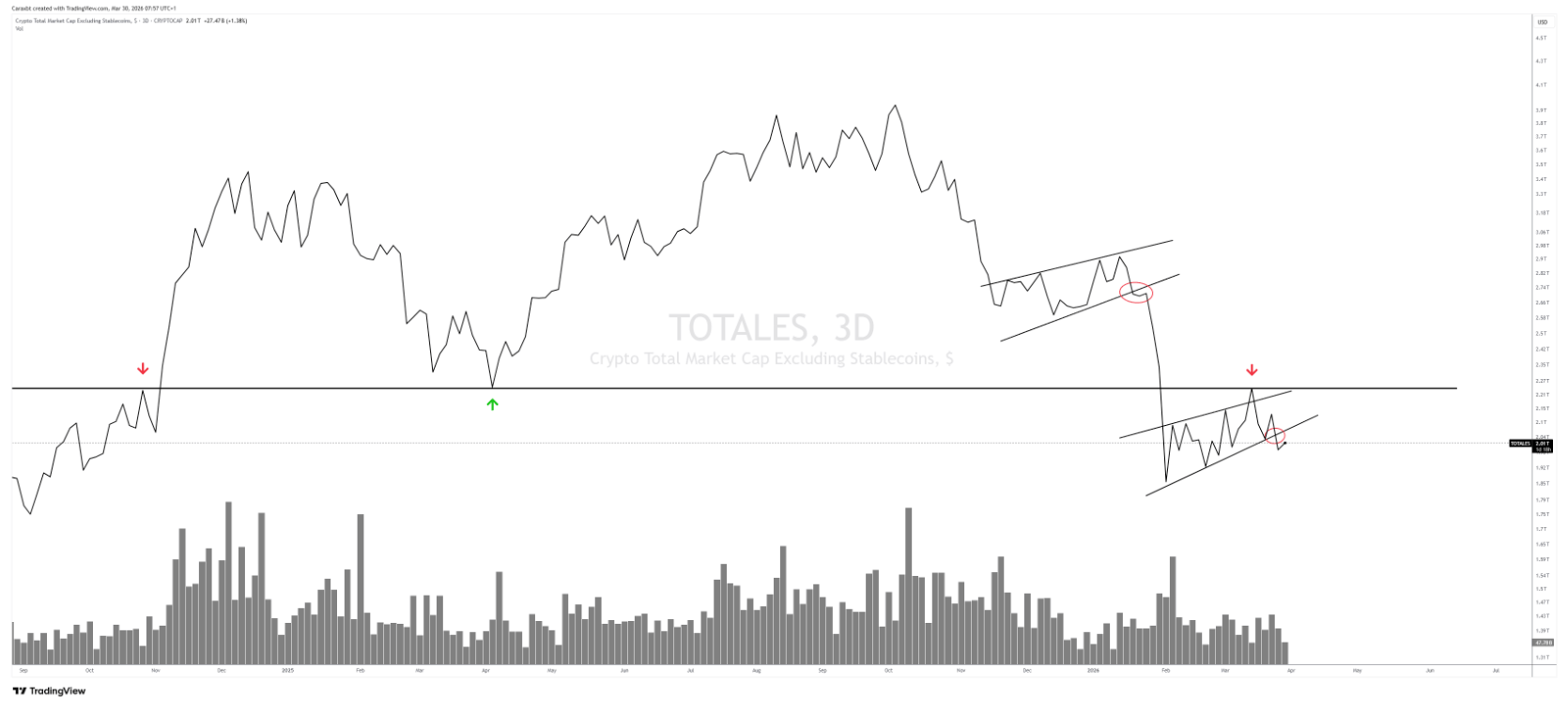 Le Bitcoin et les cryptos étant considérés comme des actifs risqués, la chute du S&P 500 n’est pas une bonne nouvelle. D’ailleurs, le TOTALES (marché crypto sans les stablecoins) ne montre rien d’encourageant pour le moment :