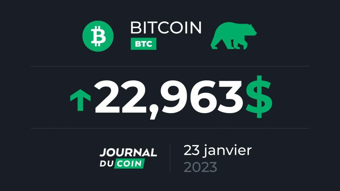 Le prix du Bitcoin monte jusqu’aux 23 169 $ sur Bitfinex aujourd’hui, 23 janvier 2023. La cryptomonnaie se négocie aux 22 963 $ au moment de la rédaction de cet article. Son cours enregistre actuellement un gain quotidien de 1,10 %.