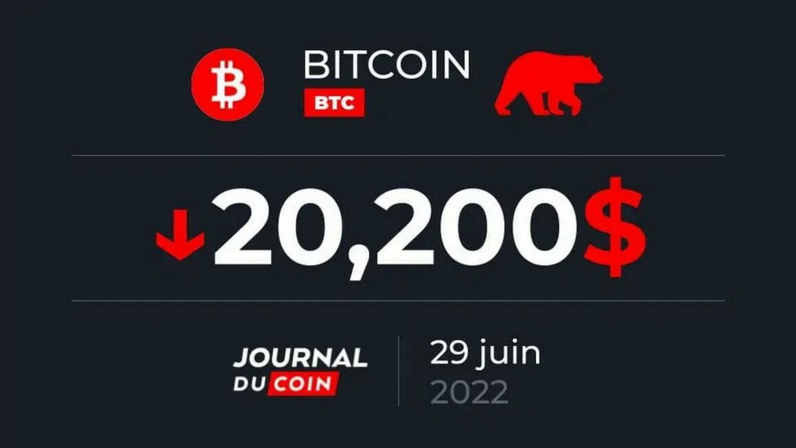Le prix du Bitcoin chute jusqu’aux environs des 19 885 $ sur Bitfinex aujourd’hui, 29 juin 2022, avant de reconquérir les 20 000 $. La cryptomonnaie se négocie à 20 200 $ au moment de la rédaction de cet article, alors que les marchés ont droit actuellement à un doji journalier.