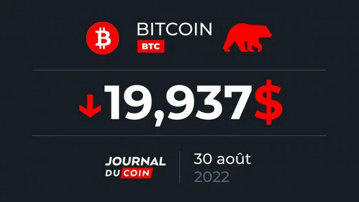 Le prix du Bitcoin chute jusqu’aux 19 574 $ sur Bitfinex aujourd’hui, 30 août 2022. La cryptomonnaie se négocie à 19 937 $ au moment de la rédaction de cet article. Son cours enregistre actuellement une perte quotidienne de 0,82 %.