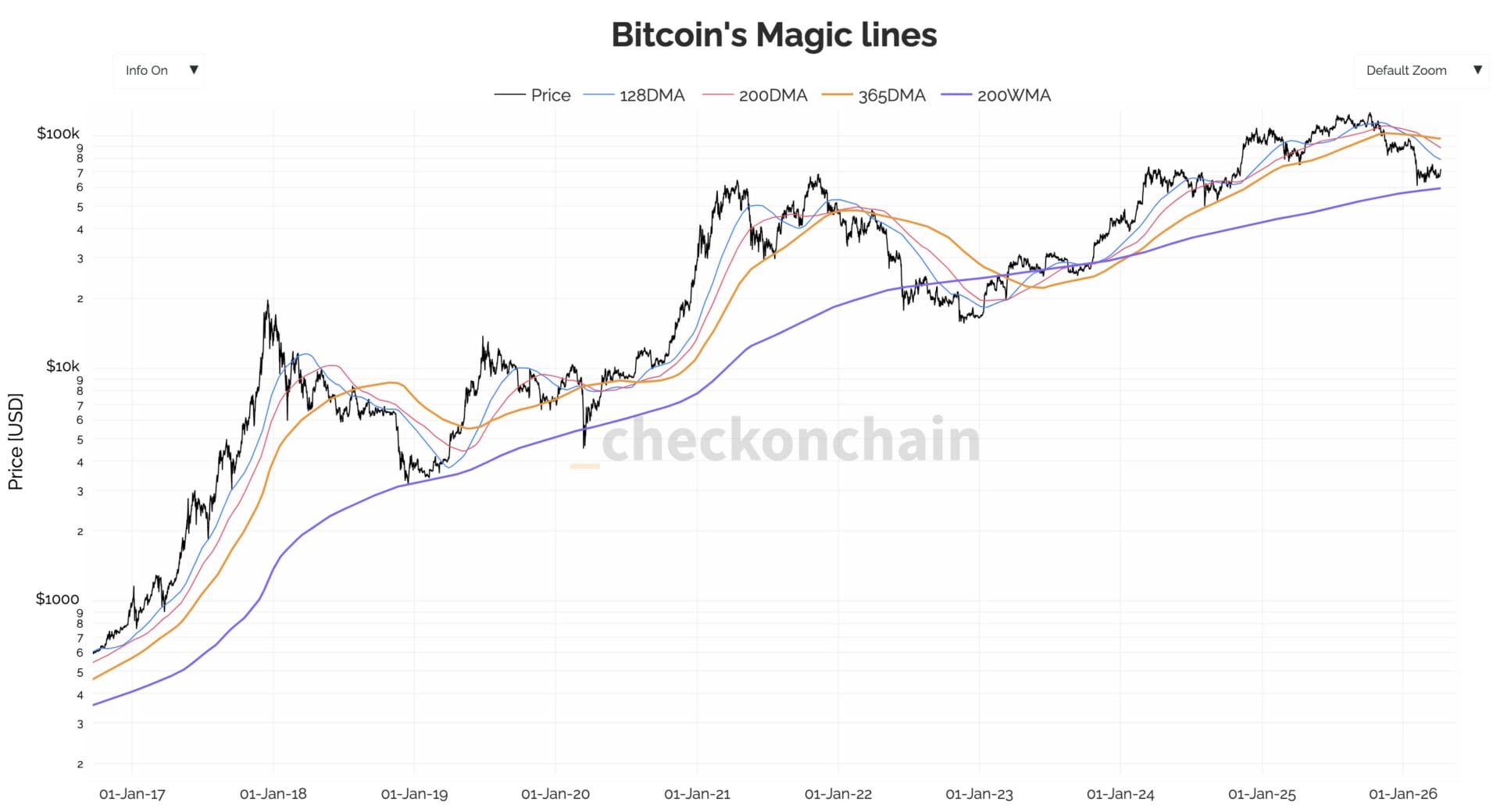 Les conditions actuelles ne reflètent pas un marché haussier. Si le cours évolue au-delà de la moyenne mobile à 200 semaines (violet), il s’échange sous les moyennes mobiles à 128, 200 et 365 jours. En cas de rebond plus important, le cours du Bitcoin devra ainsi se frotter à la zone de résistance entre les 80 000 $ et les 100 000 $.