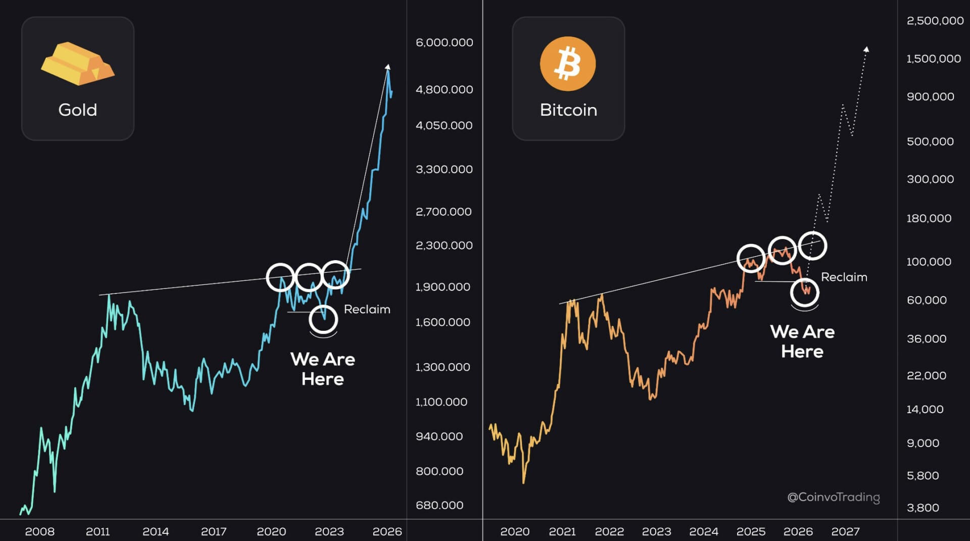 Le Bitcoin dessine des structures qui ressemblent à celles de l’or avant son explosion haussière. Source : CoinvoTrading.
