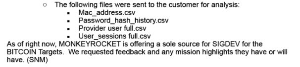 Si ce programme de surveillance est de large envergure, MONKEYROCKET semble être très orienté vers les utilisateurs de Bitcoin. Il est précisé dans un autre papier que MONKEYROCKET « était la seule source de renseignement pour les cibles BITCOIN ». Les données réunies par ce programme sont définies comme des « prises complètes », ce qui signifie que l’entièreté des données transitant sur le réseau sera analysée, et qu’une partie de ces données sera conservée pour une étude ultérieure.