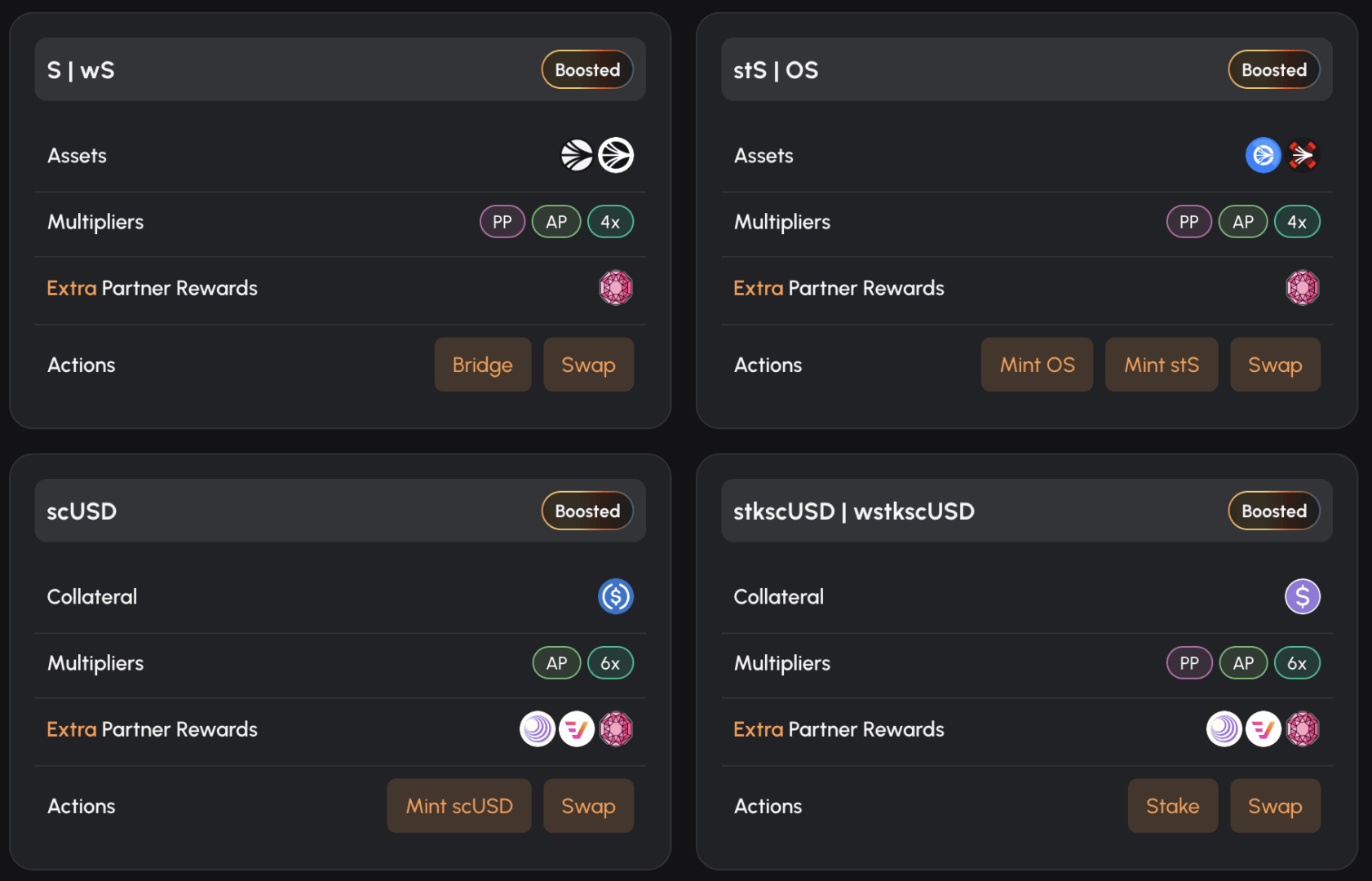 La première stratégie, la moins risquée, réside dans le fait de détenir des actifs éligibles sur la blockchain Sonic. Cela concerne le S, le jeton natif de Sonic, le scUSD, un stablecoin natif à Sonic ou encore les scETH ou scBTC, des versions tokenisées de l’ETH et du BTC sur Sonic. En détenant simplement ces jetons (ou l’un des 13 jetons éligibles) vous allez obtenir des Passive Points. À noter que certains actifs disposent d’un multiplicateur sur le nombre de points obtenus.