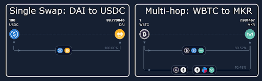 Le Smart Order Router est le système qui permet aux traders de Balancer d’obtenir les meilleurs prix en fonction des jetons d’entrée et de sortie. Le chemin pour l’échange peut utiliser un ou plusieurs pools (sauts multiples).
