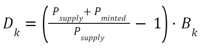 On calcule la quantité de jetons Dk (pour chaque jeton k) à déposer dans le pool pour créer Pminted jetons LP, étant donné la quantité totale Psupply de jetons LP, et les soldes Bk de chaque jeton k en réserve avant le dépôt :