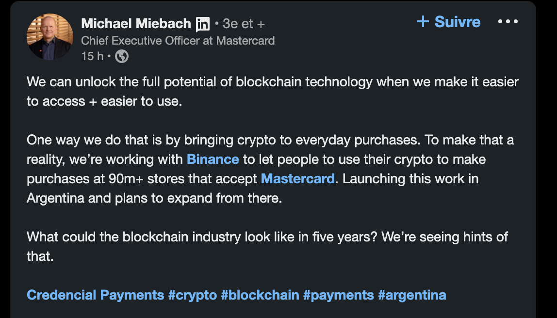 Faire-part – Ce n’est plus un secret : Binance et Mastercard s’associent en Argentine et lancent une carte prépayée. Quel est alors l’objectif de ce mariage de raison ? Participer à l’adoption des cryptomonnaies sur le continent sud américain et surtout, comme l’a annoncé le CEO de Mastercard profiter des opportunités que peuvent lui apporter la blockchain et les cryptomonnaies.
