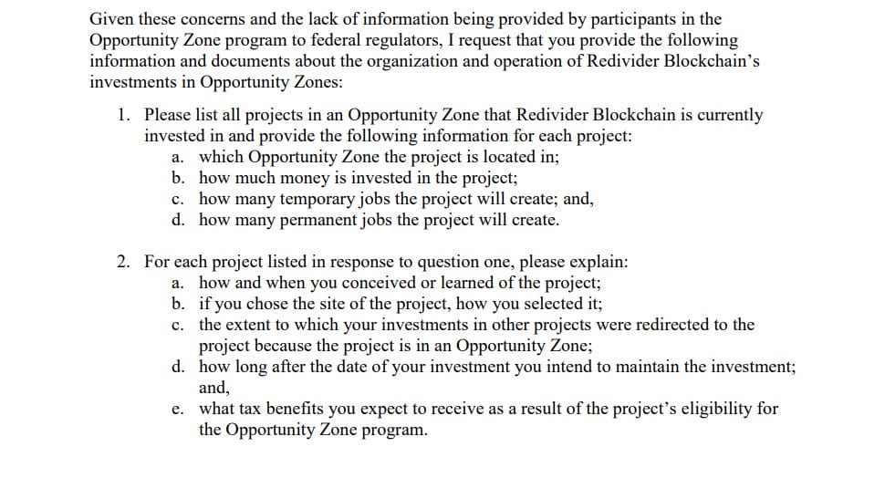 De ce fait, le sénateur a envoyé des courriers aux entreprises de minage citées précédemment et aussi à un comptable du cabinet HCVT spécialiste de ces « zones franches », Blake Christian. Dans ces lettres, il leur est demandé de fournir des informations sur les mesures mises en place par chaque entreprise engagée dans le programme pour participer à l’essor économique de la région.