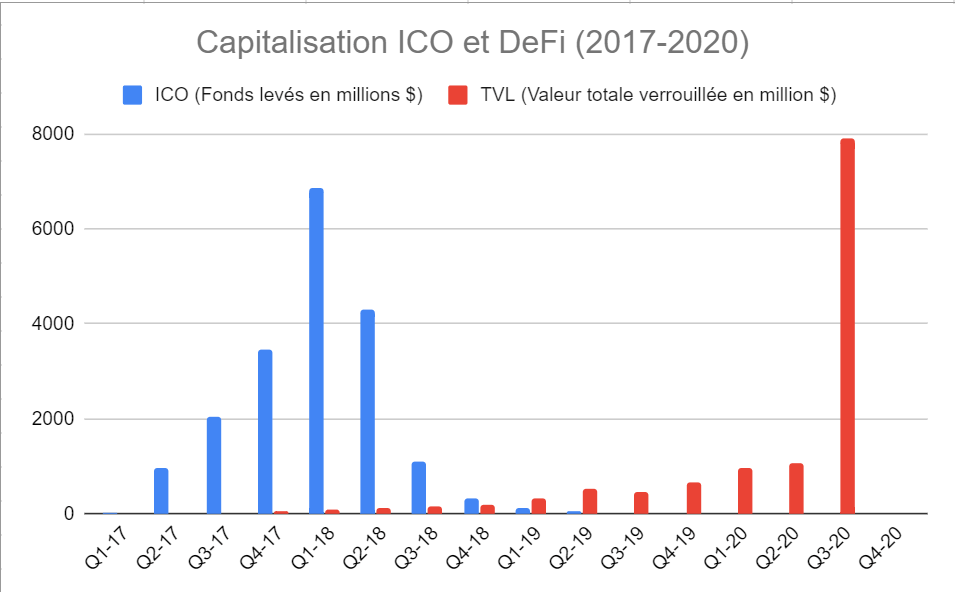 Si l’on compare la valeur totale mise sous séquestre au sein de la DeFi (aussi appelée TVL pour Total Value Locked) et les sommes investies dans les ICOs, on retrouve les mêmes ordres de grandeur. La croissance de la DeFi est cependant largement supérieure à celle des ICO.