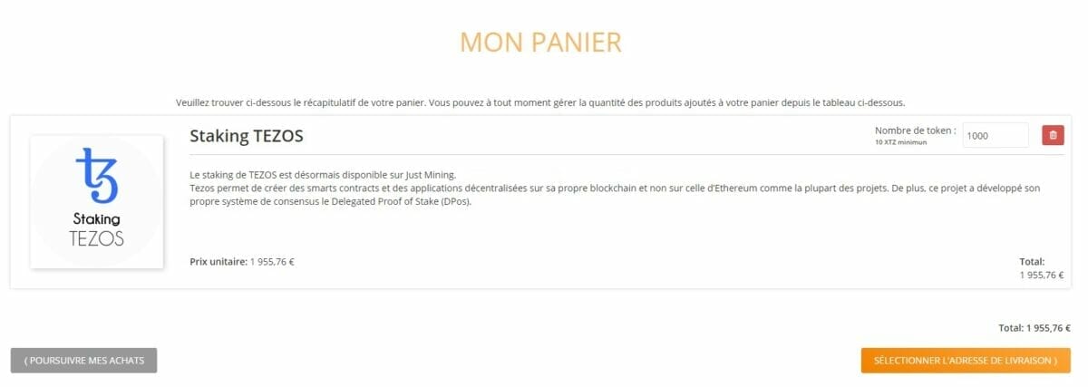 Si je souhaite acheter des XTZ pour faire du staking, il suffit de sélectionner le produit correspondant. Il sera ensuite disponible dans le panier. La quantité de tokens minimale est ici de 10, soit moins de 20 euros ! Attention cependant, le minimum requis pour participer au staking est de 25 XTZ.