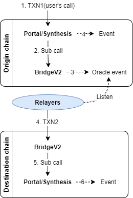 Les smart contracts de liaison (BridgeV2 contracts, que nous décrirons plus bas) envoient les événements aux relayeurs lorsqu’ils sont appelés par les contrats de Portail et de Synthèse (Portal & Synthesis contracts). Après consensus, les relayeurs vont alors signer et diffuser la transaction sur la chaîne correspondante.