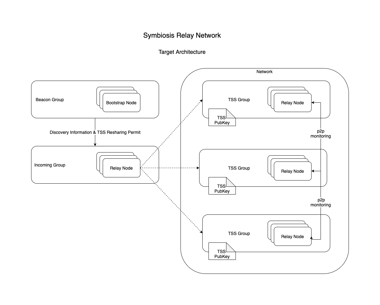 Les nœuds composent des groupes dits groupes TSS. Chaque groupe a son propre ensemble de transactions et sa propre clef de signature distribuée. Les transactions sont signées via le TSS :
