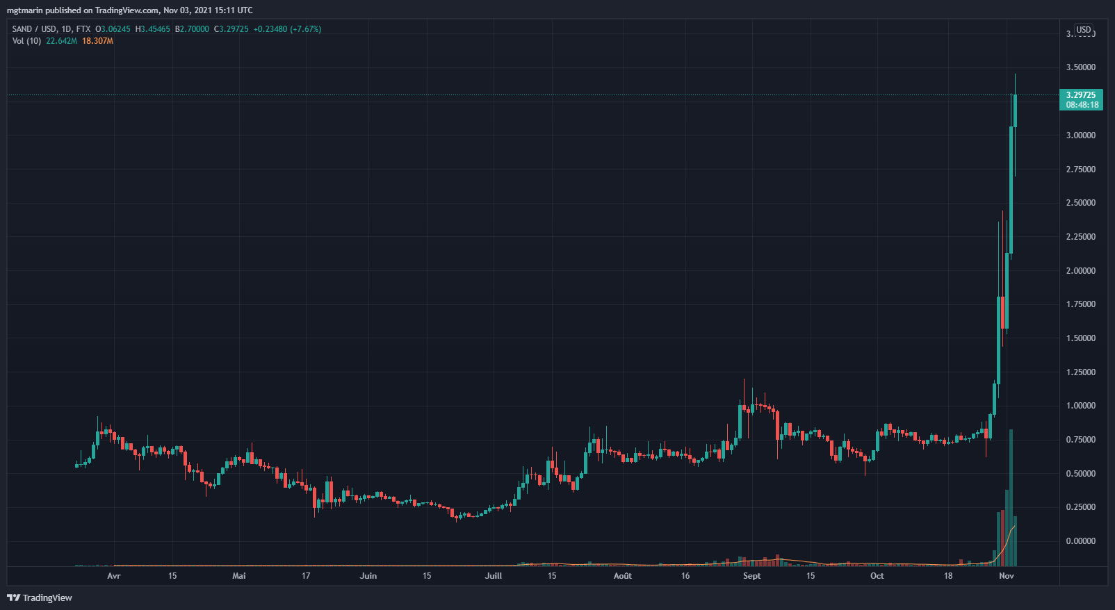 À titre d’illustration, le jeton MANA qui alimente la plateforme Decentraland a augmenté de plus de 280 % au cours de la dernière semaine. Le SAND n’en est pas en reste. Depuis l’annonce de la fin du mois d’octobre et au jour de rédaction de l’article, le prix du token a bondi de plus de 300 %. Ajouter à cela la réussite de la levée de fonds, de beaux jours semble se profiler pour The Sandbox.