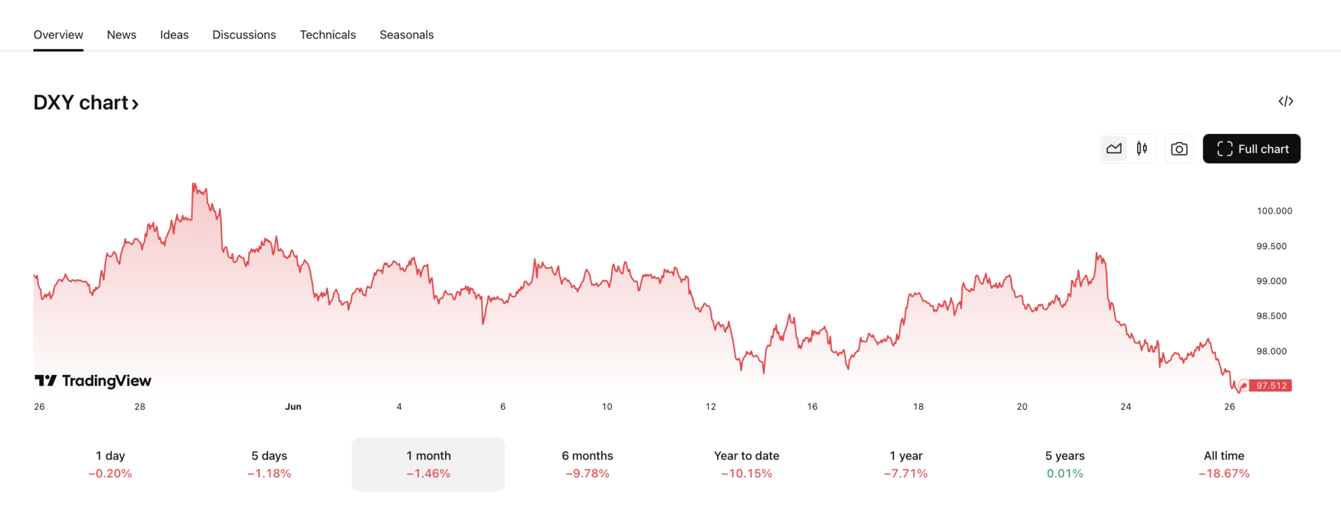 Alors que le dollar américain atteint son niveau le plus bas depuis trois ans, Bitcoin montre des signes de reprise. Selon les données, l’indice du dollar américain (DXY) est tombé à 97,50, un niveau qu’il n’avait pas atteint depuis février 2022. Cette baisse survient malgré les tensions géopolitiques récentes entre l’Iran et Israël, qui auraient normalement dû renforcer le dollar en tant que valeur refuge.