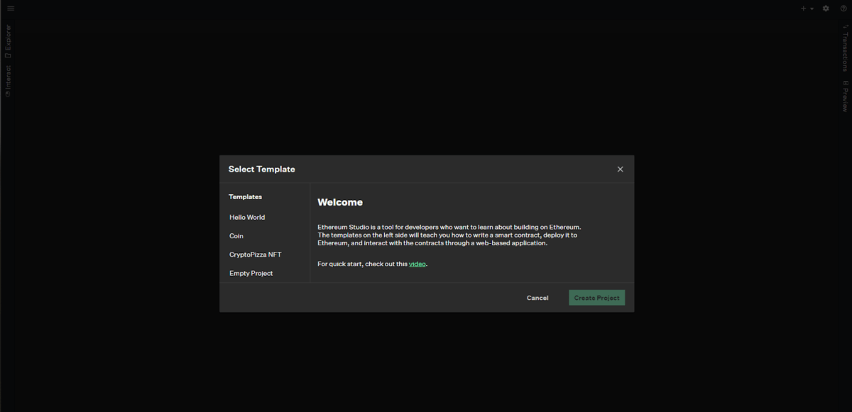 Pour se lancer dans un nouveau projet par le biais d’Ethereum Studio, rien de plus simple. Il vous suffira simplement de vous rendre sur le site web dédié d’Ethereum Studio. L’interface vous proposera alors de sélectionner l’un des projets disponibles pour débuter ou tout simplement mettre en place votre propre projet personnel. Alors que je vous présenterai plus en détail le projet « Hello World » par la suite, découvrons ce qu’Ethereum Studio nous réserve lorsque nous choisissons un projet libre.