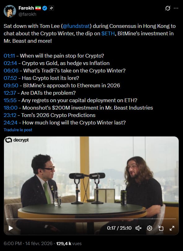 BitMine a également annoncé un investissement de 200 millions de dollars dans Beast Industries, la structure du créateur MrBeast. Ce choix stratégique vise à favoriser l’adoption des technologies blockchain auprès des nouvelles générations (Gen Z et Gen Alpha). En intégrant des services financiers basés sur l’Ethereum à une audience dépassant le milliard de followers, l’objectif est de transformer l’infrastructure DeFi en un outil de services bancaires courants, consolidant ainsi la valeur fondamentale du réseau sur le long terme.