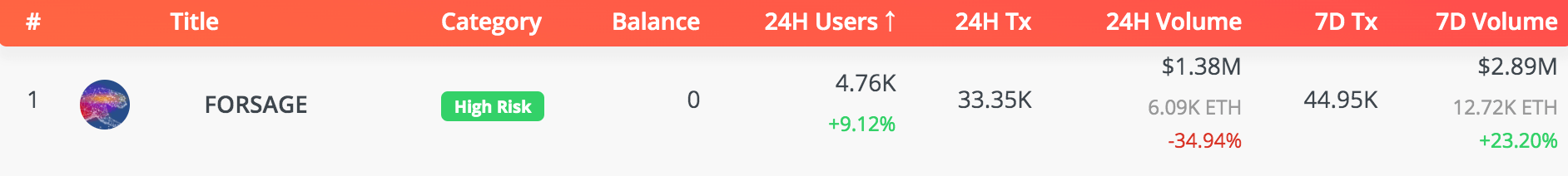 Forsage est la première application décentralisée d’Ethereum, d’après les données de Dappstats. En effet, cette dernière réunit plus de 4000 utilisateurs quotidiens et est à l’origine de plus de 33 000 transactions au cours des dernières 24h.
