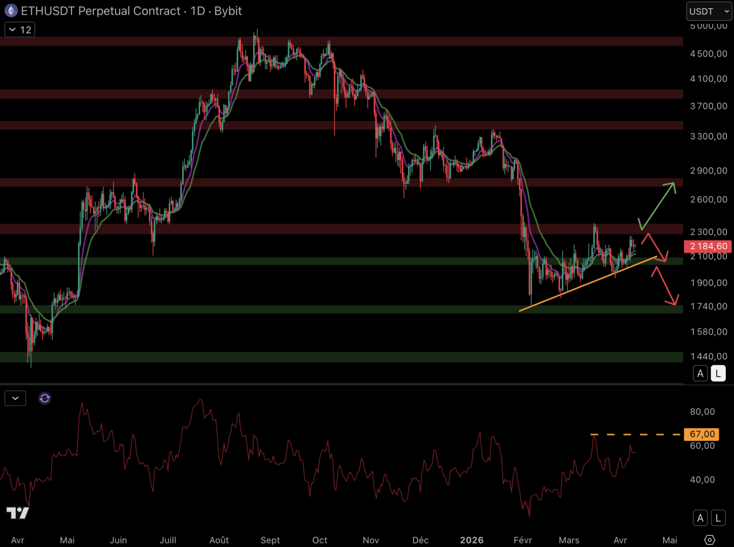Si la résistance à 2 350 $ tient, le cours pourrait retrouver le support à 2 100 $. Et si la pression vendeuse est forte, un retour à 1 700 $ est possible. Le momentum restera solide si le RSI passe au-delà du dernier sommet à 67.