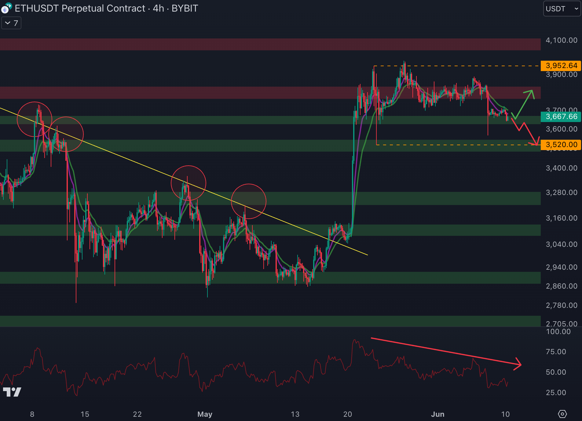 Le cours d'Ethereum pourrait trouver des acheteurs sur le support 4H à 3 650 $ - 10 juin 2024.