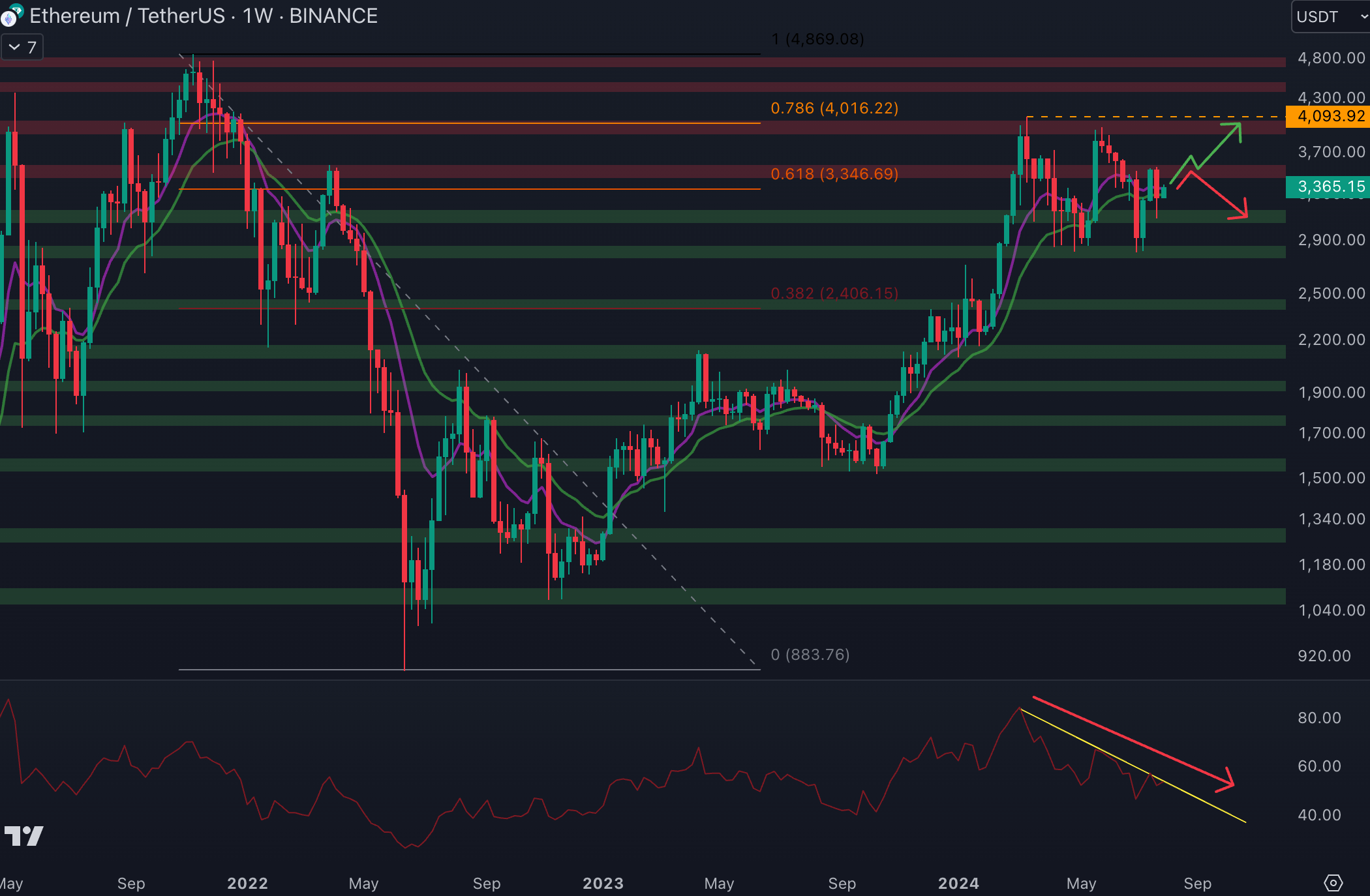 Depuis le mois de mars, les acheteurs et les vendeurs se neutralisent. En effet, le cours évolue dans un range entre les 2 800 $ et les 4 000 $, et cela, malgré le lancement des ETF Ethereum au comptant. Toutefois, la tendance primaire reste haussière, et le biais institutionnel (EMA 9/EMA 18) est bullish en hebdomadaire :