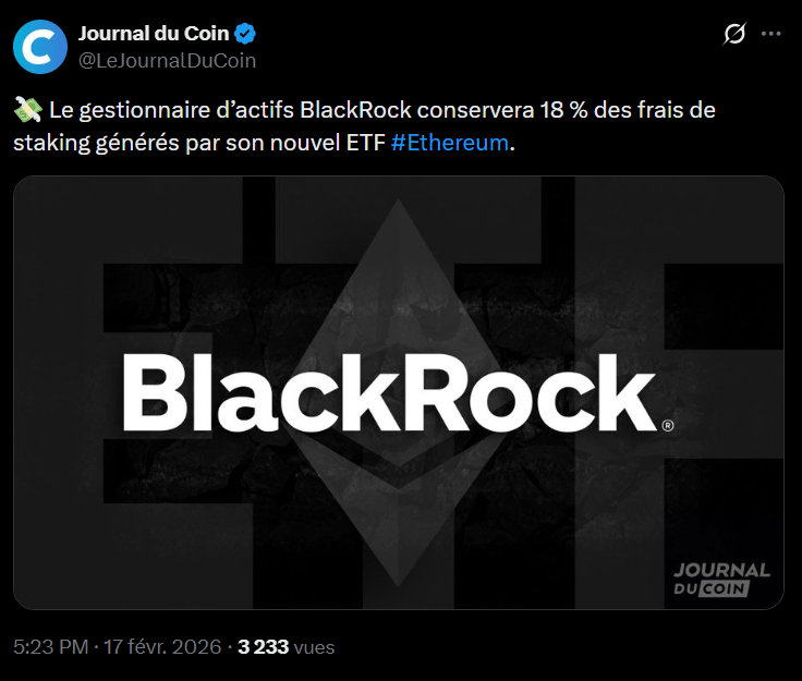 Le staking s’institutionnalise. Alors que le marché surveille étroitement les flux institutionnels, BlackRock, le plus grand gestionnaire d’actifs au monde, accélère le lancement de son fonds Ethereum producteur de rendement aux États-Unis. Selon une mise à jour du formulaire S-1 déposée ce mardi 17 février 2026, une filiale du groupe a déjà fait l’acquisition de 4 000 actions de seed pour un montant de 100 000 dollars. Ce capital initial servira à l’achat des premiers éthers qui constitueront la base du trust.