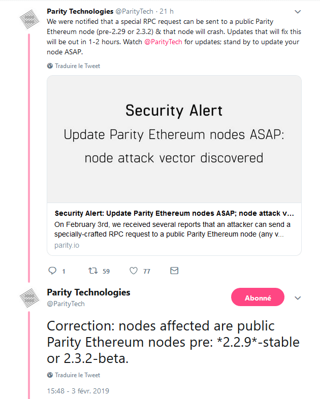 C’est ce 3 février que l’équipe de Parity Technologies a alerté ses utilisateurs : plusieurs rapports indiquaient que des nœuds publics Parity pouvaient être victimes d’une attaque ciblée, exploitant une faille dans les requêtes RPC (« Remote procedure call »), qui entraîne la mise hors service des nœuds affectés.