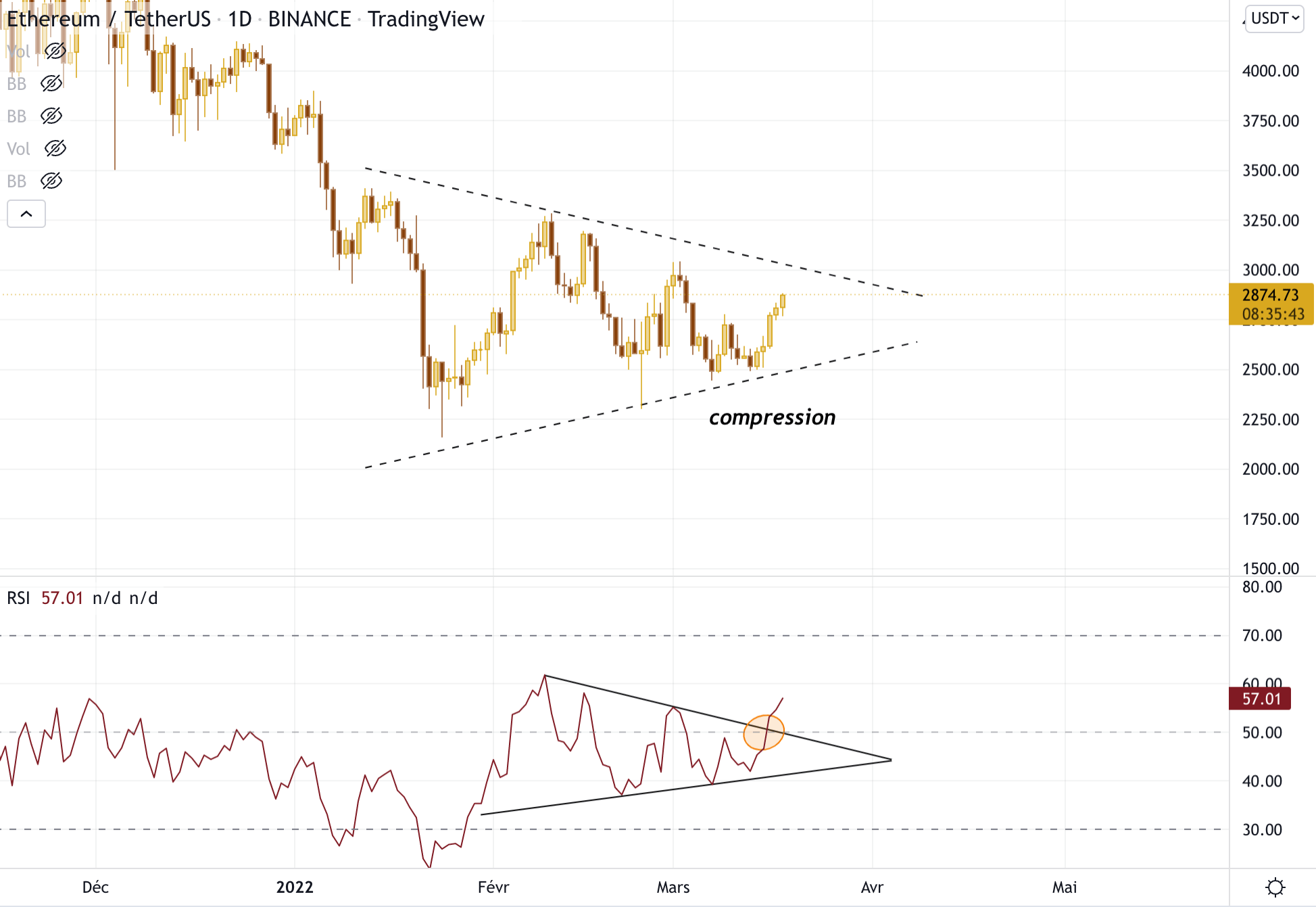 Le momentum est bullish grâce aux cassures de 50 et 55 de RSI. Le momentum semble sortir de sa contraction par le haut, c’est peut-être une indication pour la suite.