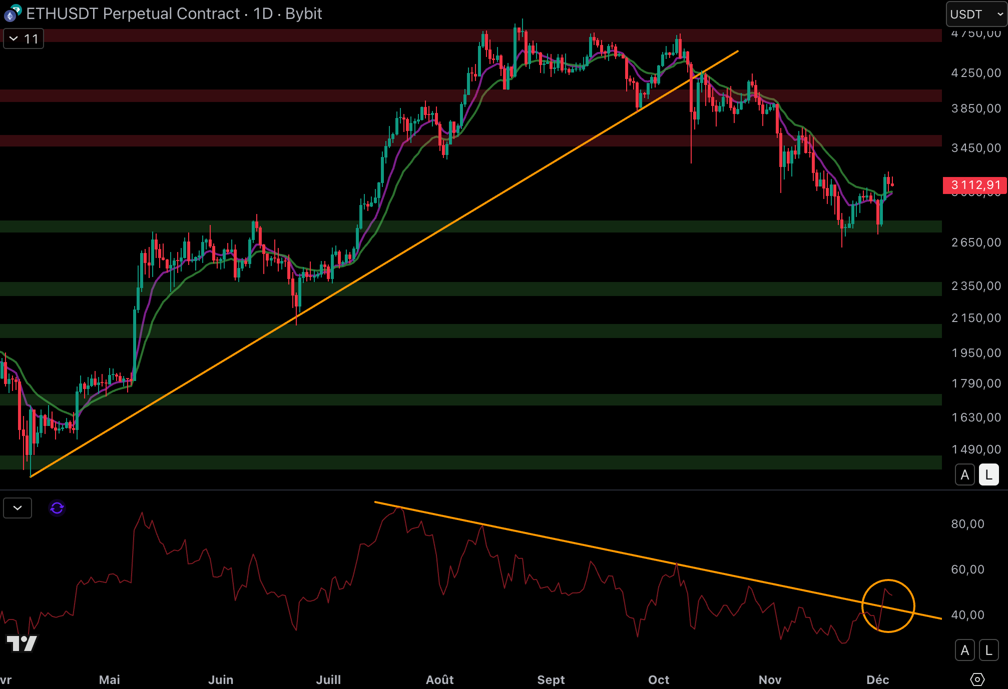ETH affiche une dynamique baissière en journalier depuis le top autour des 5 000 $. Mais le cours parvient pour le moment à conserver le support à 2 800 $ :