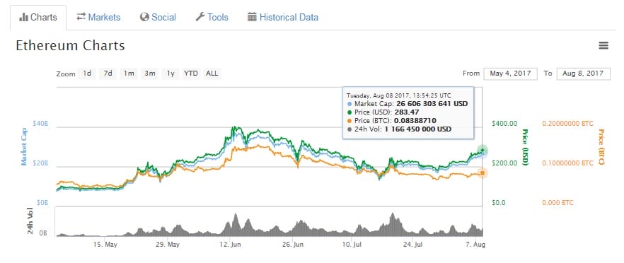 Le cours de l’Ethereum, après avoir explosé au début de l’été, atteignant un « all time hight » à 405 dollars à la mi-juin, a ensuite connu une lente redescente jusqu’à 148 dollars à la mi-juillet, pour revenir dans une tendance haussière, au moment de la rédaction de l’article à 283 dollars.