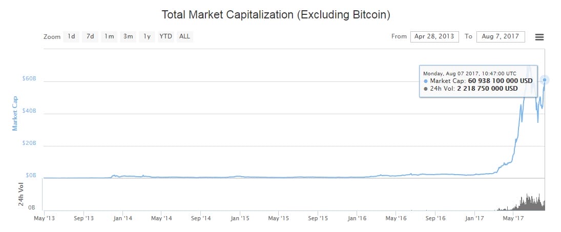 Ce chiffre est à mettre en perspective, car l’Ethereum avec plus de 25 milliards de dollars, représente cette fois-ci près de 42 % de la capitalisation boursière totale des Altcoins.